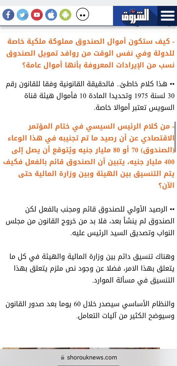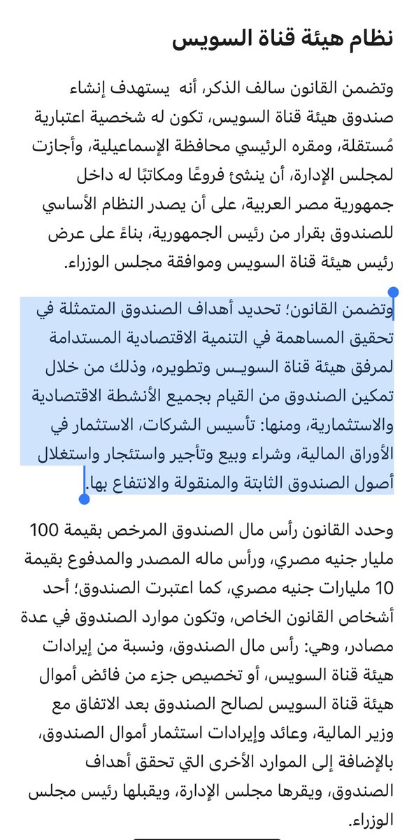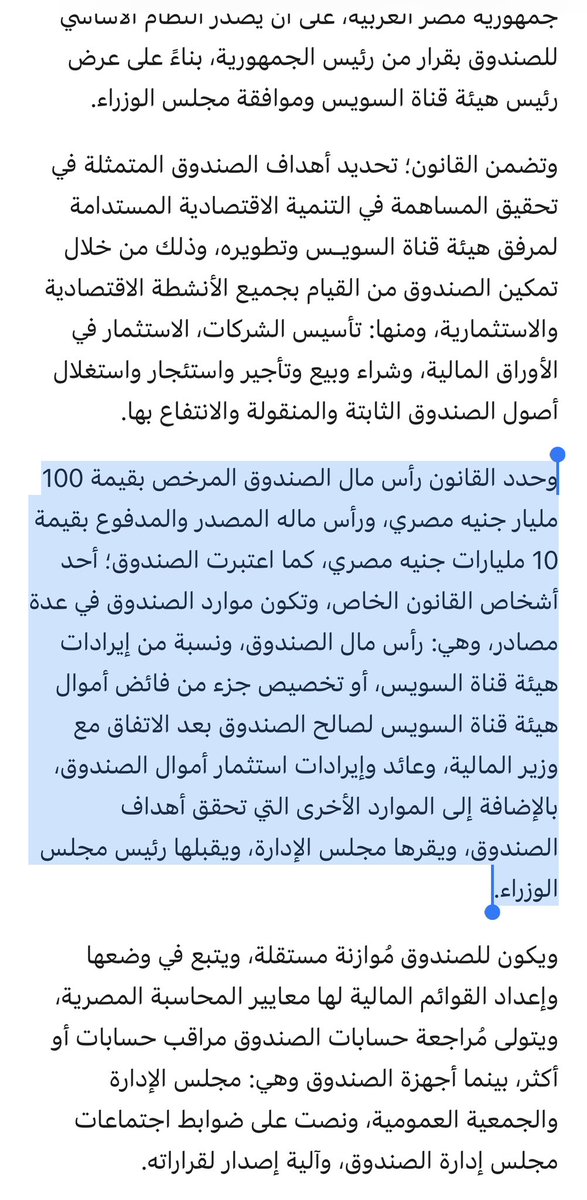 "وكان الرئيس المصري عبد الفتاح السيسي قد أشار خلال حديثه في المؤتمر الاقتصادي، أكتوبر الماضي، إلى فكرة «إنشاء صندوق هيئة قناة السويس» موجهاً بأن «يكون رأس ماله نسبة من إيرادات هيئة قناة السويس والفائض المالي التابع لها»