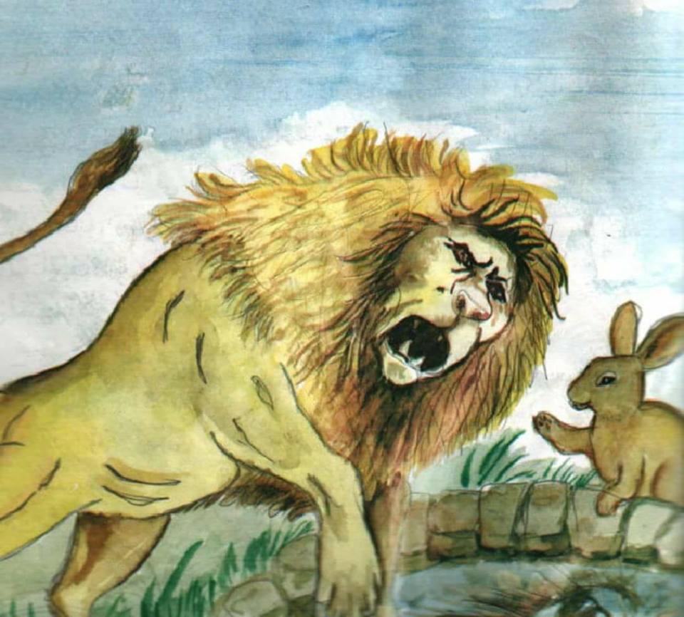 عندئذ قرر الارنب الخروج من الجحر والتاكد من صحة مزاعم الاسد.