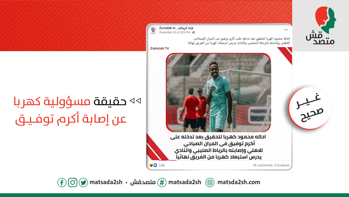 - توفيق قال أمس السبت، 24 ديسمبر 2022، عبر حسابه على انستجرام: "فى ناس بتقول إن كهربا سبب الإصابة، مفيش حاجة اسمها كده، مفيش أي التحام بيني وبين كهربا، ده قدر والقدر مفيهوش مفر". ✅✅