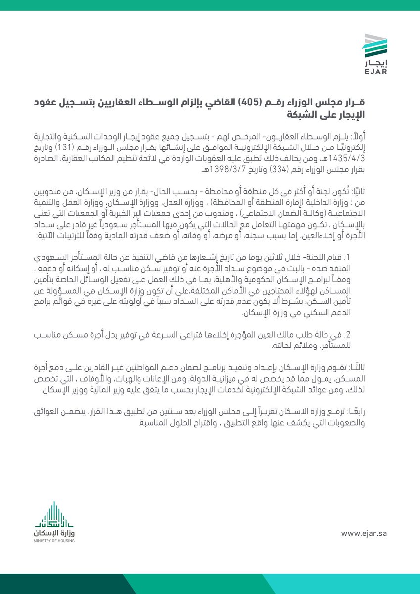 🏷️ تقديم الدعم للمواطن الذي صدر عليه قرار من #محكمة_التنفيذ بعدم سداد أجرة المسكن ، 🏷️ او بسبب الاخلاء وثبت عدم قدرته الوفاء بالالتزامات المادية كونه أحد الفئات الأربعة .