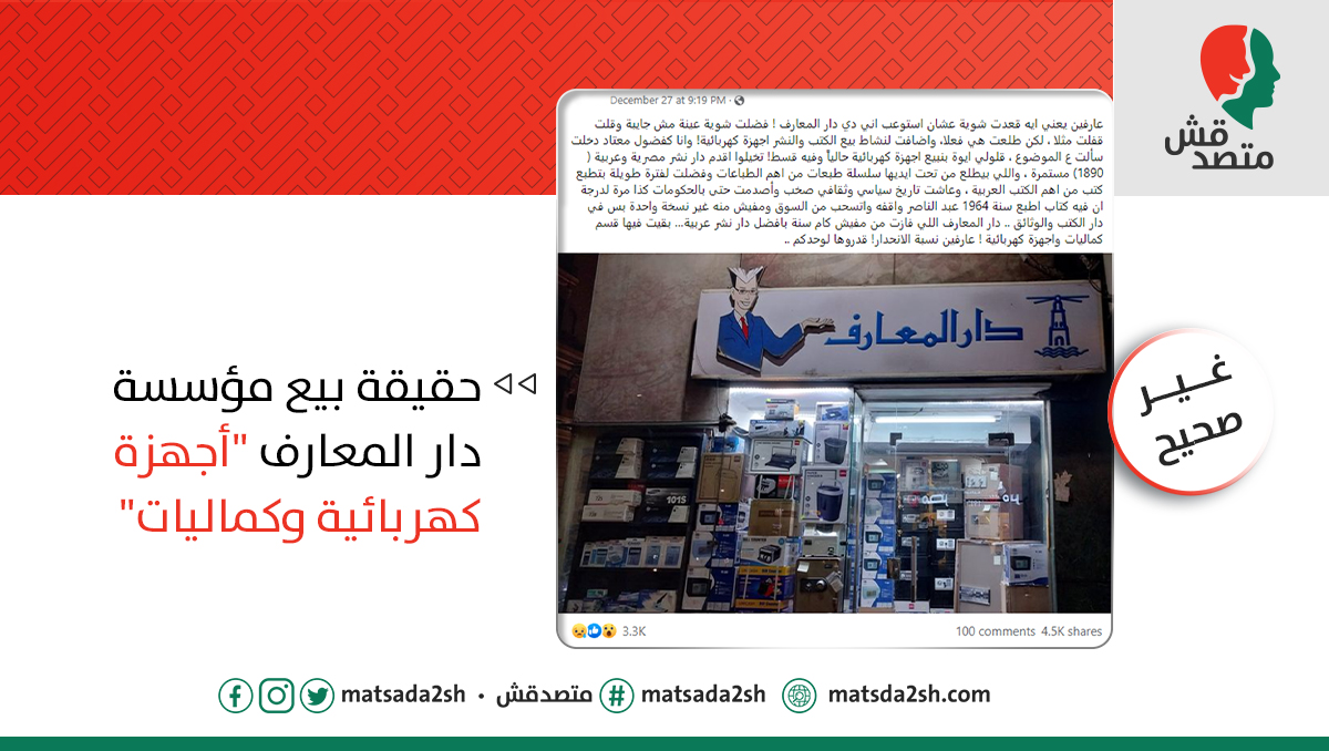 - بوست منتشر بشكل كبير جدًا، مرفق معه صورة لواجهة أحد فروع "دار المعارف"، بيقول: "قعدت شوية عشان استوعب اني دي دار المعارف ! اضافت لنشاط بيع الكتب والنشر أجهزة كهربائية! قالولي ايوة بنبيع اجهزة كهربائية حالياً وفيه قسط!
