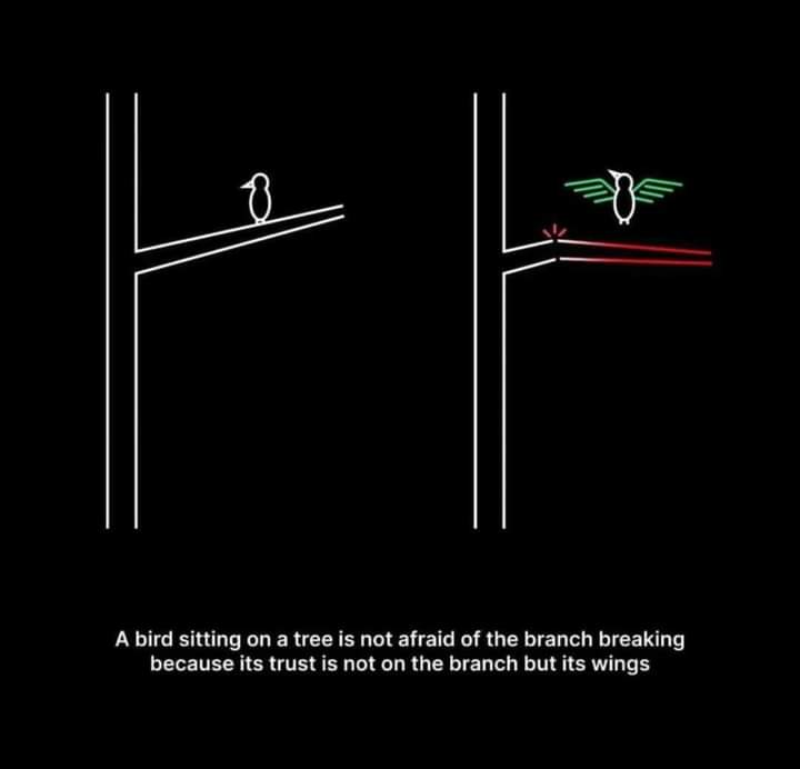 الطائر عنده الثقة الكافيه اللي تخليه واقف علي الغصن بدون خوف او قلق لان واثق في جناحاته هتشيله لو الغصن اتكسر