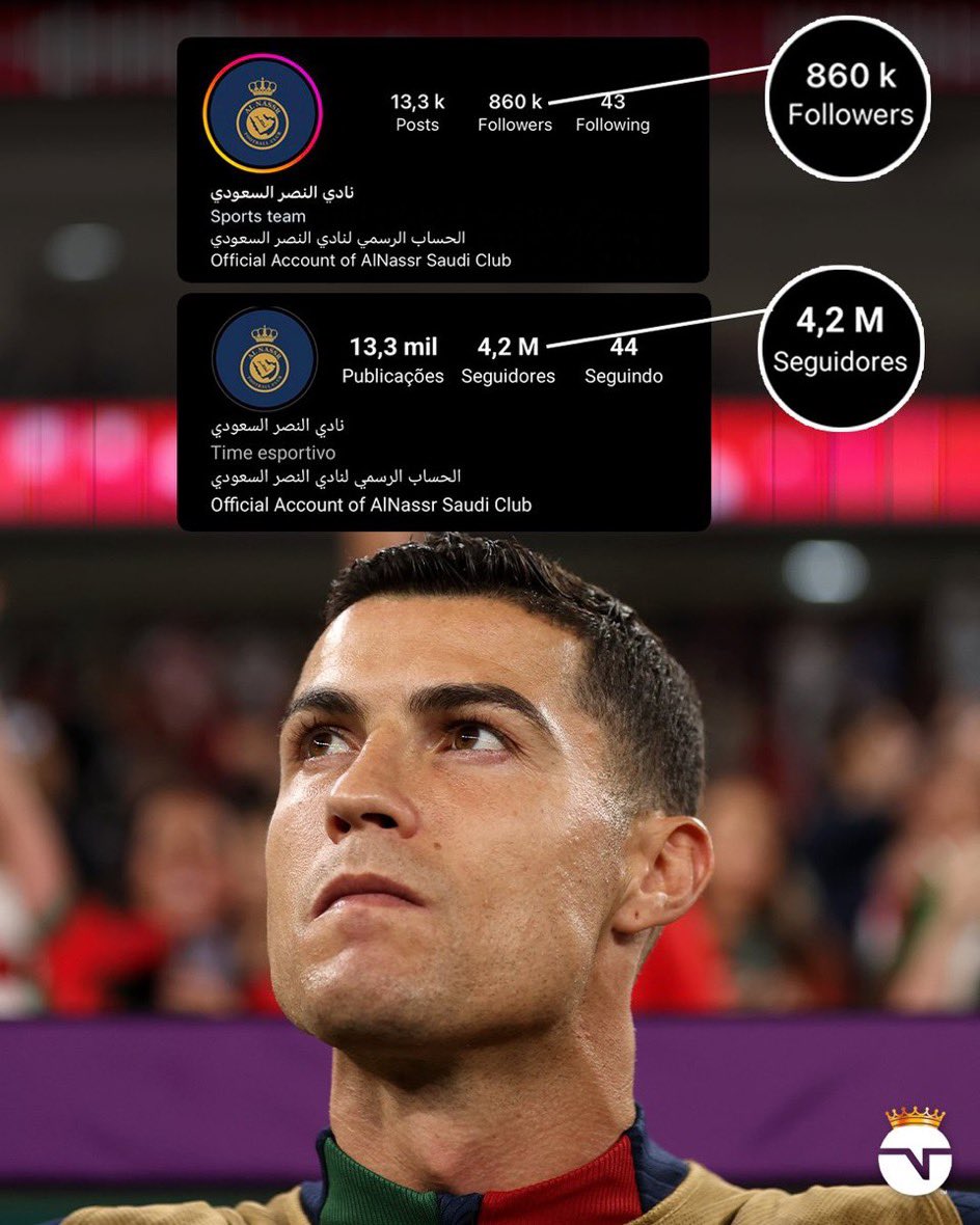 كريستيانو رونالدو يـوقع مع نادي #النصر أحد أكبر الفرق في السـعودية ، وهو الذي لديه نفوذ كافٍ لجذب أحد أفضل اللاعبين في العالم .