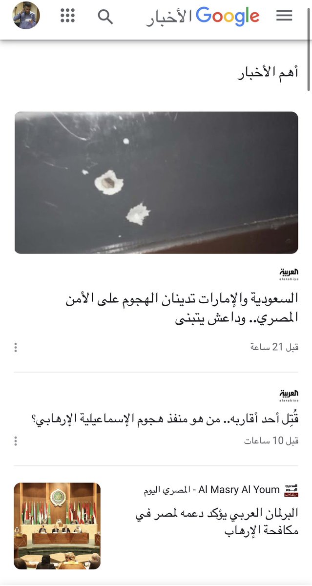 إعلام الدولة المصرية مهتم بتقديم الحادث كعملية تصدي لهجوم إرهابي ومقتل منفذ الهجوم، وصورته موجوده.