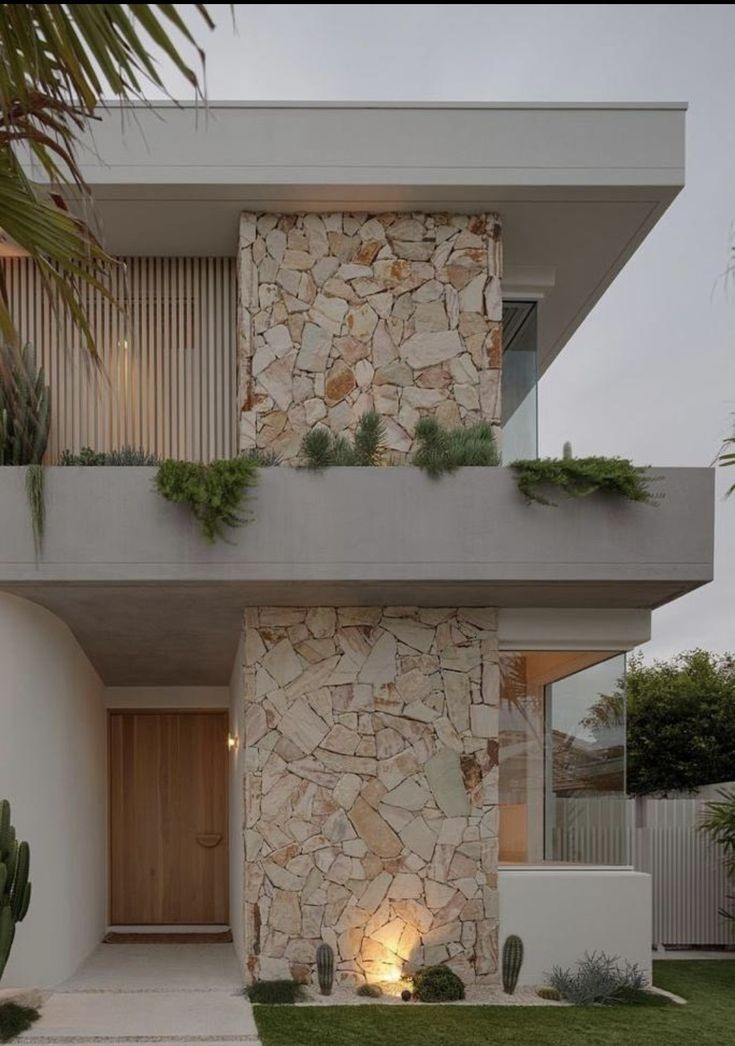 من خلال دمج المظهر الحجري مع المداخل الزجاجية او اكساء جدارن كاملة بها في منطقة محددة.