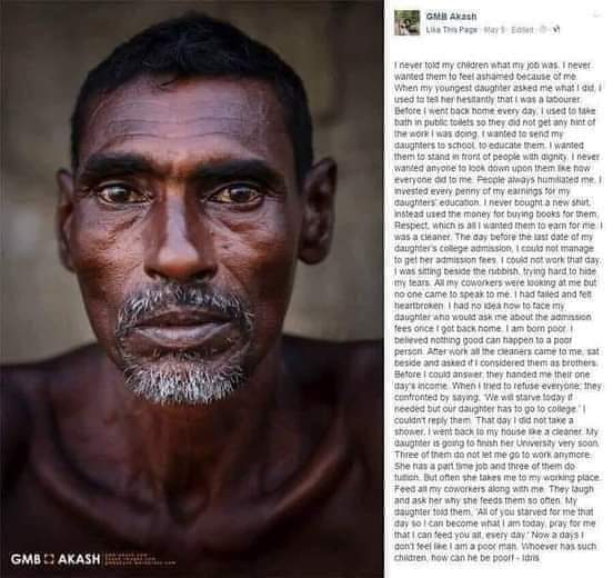 في اليوم السابق لموعد تقديم ابنتي الأولى في الجامعة، لم أتمكن من توفير رسوم القبول، لم استطع العمل في ذلك اليوم. فجلست بجوار القمامة محاولًا أن أخفي دموعي لقد فشلت في تحقيق حلمها بدخول الجامعة، وكنت أشعر بالحزن