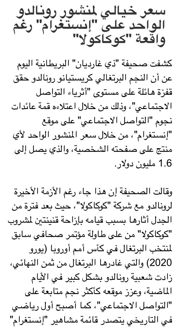 مخطئ ان كنت تعتقد ان رونالدو سيأتي فقط بحقائبه وعائلته وخبراته.. ستسبقه الشركات والعلامات التجارية التي ترعاه.. اللي ستتابع كل تحركاته ومستجدات تواجده