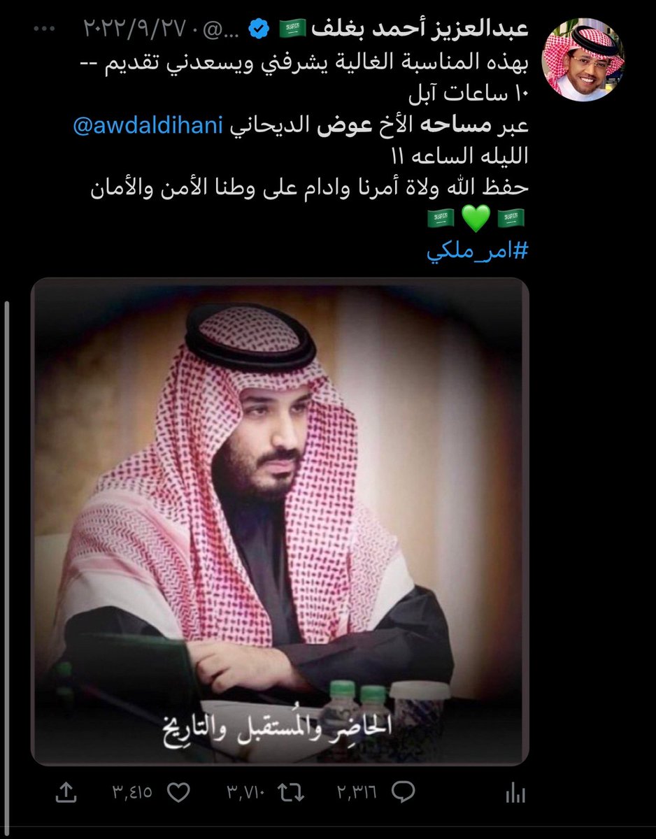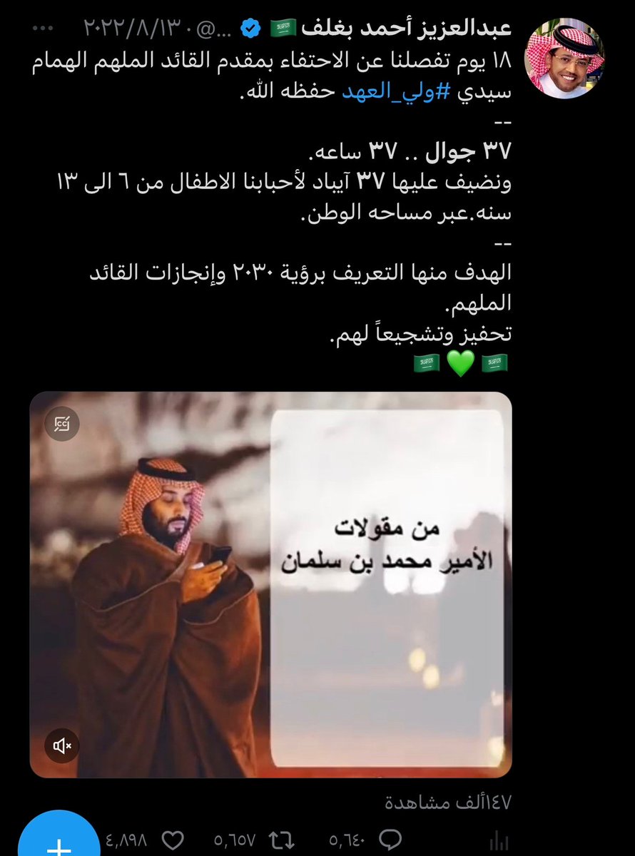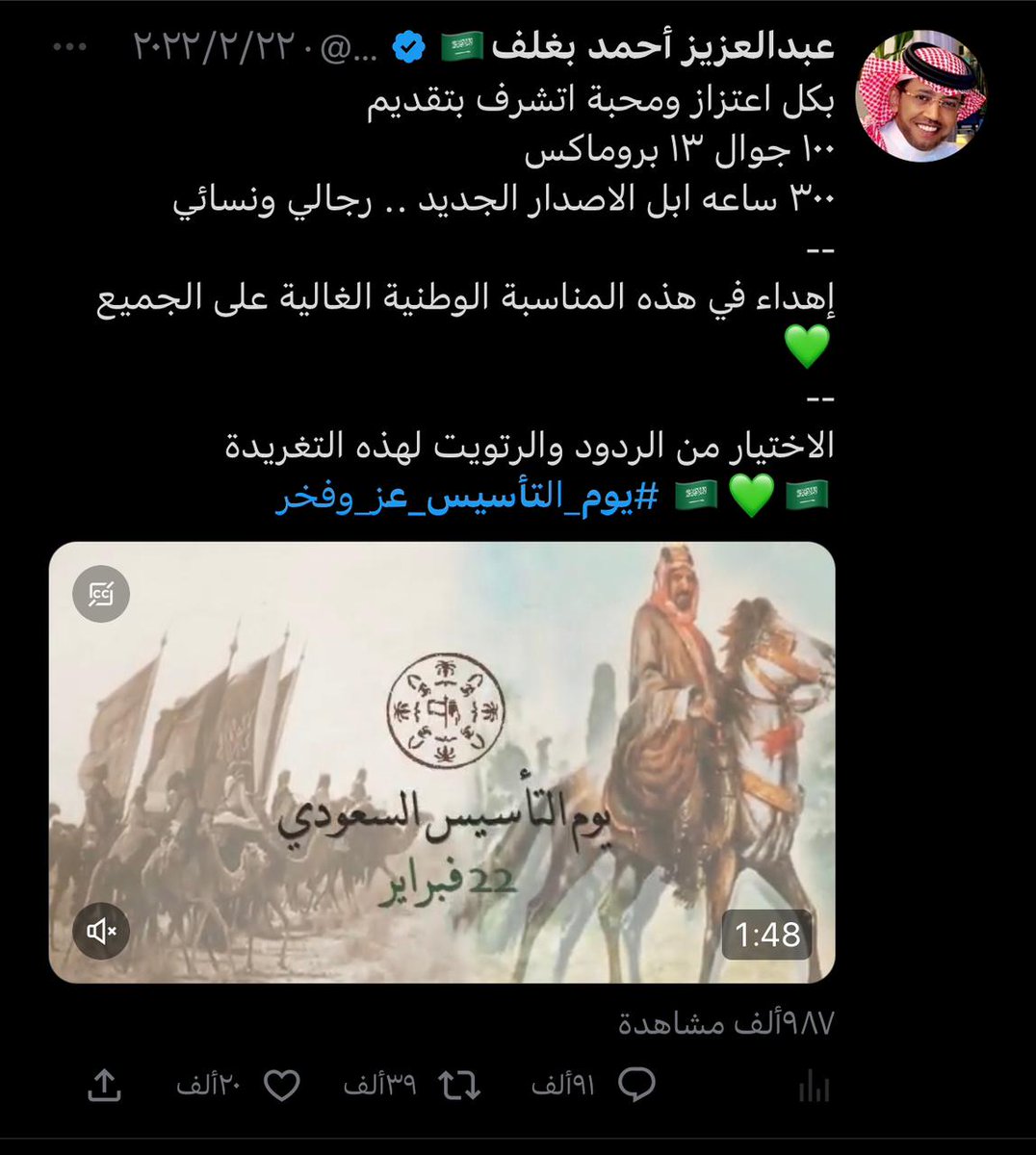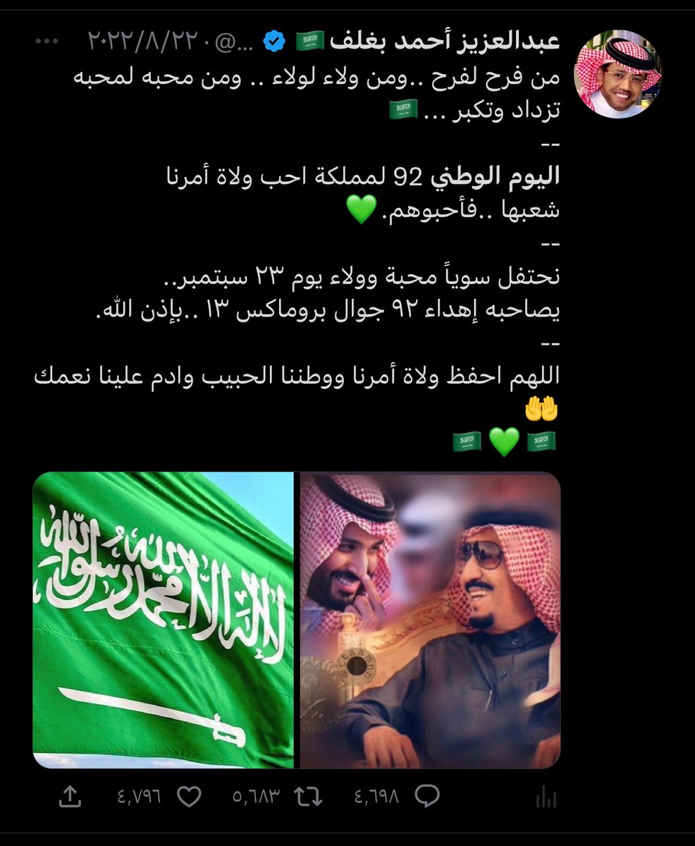 صاحب التجارب الفريدة والمميزة صاحب العطاء وابن الوطن البار ، اسال الله يكون عام 2023 ممتلئ بالخير و السعادة لك ، وان يديمك ابن بار للوطن ، وان يديمك لنا اخ وصديقا وعزيزا لقلوبنا 🇸🇦💚🇸🇦