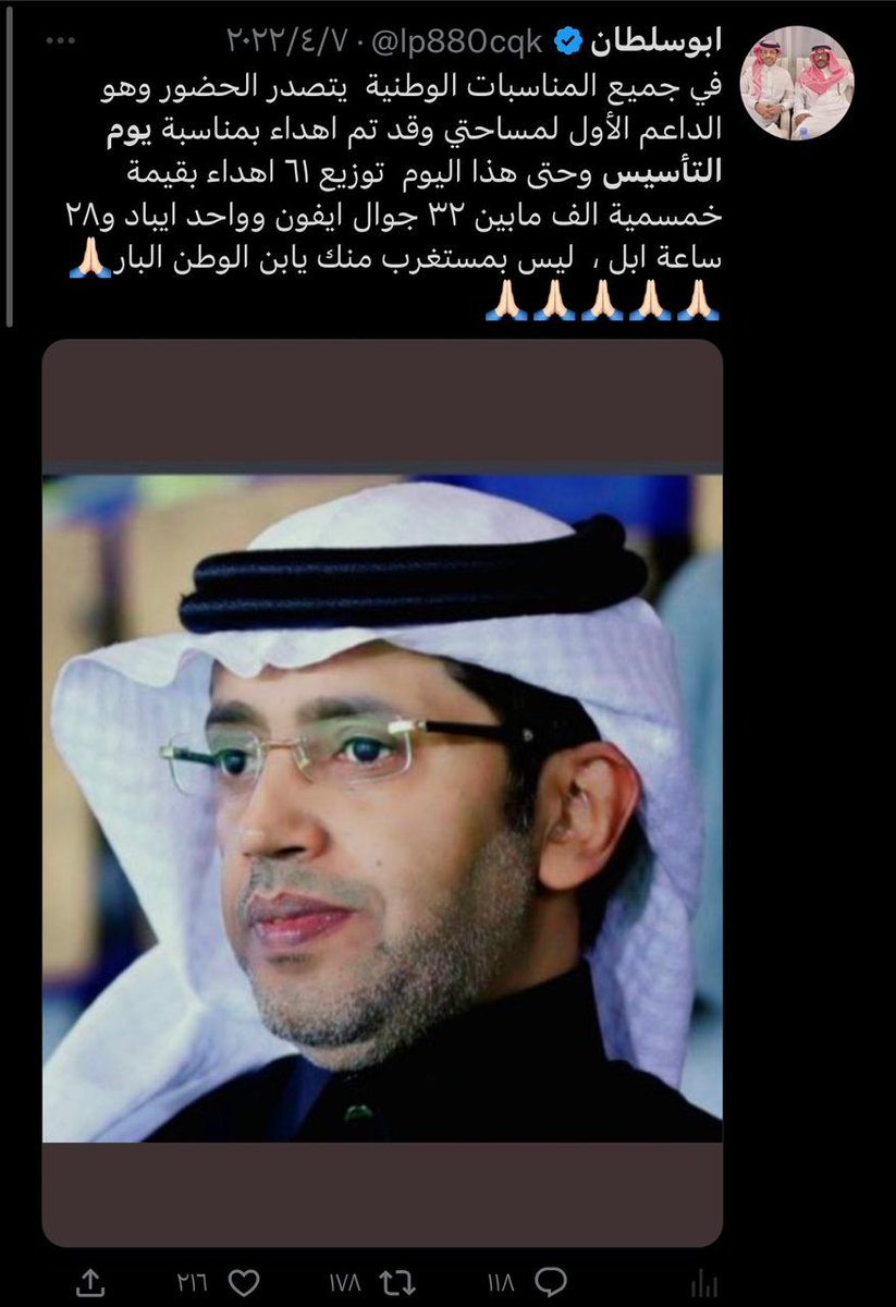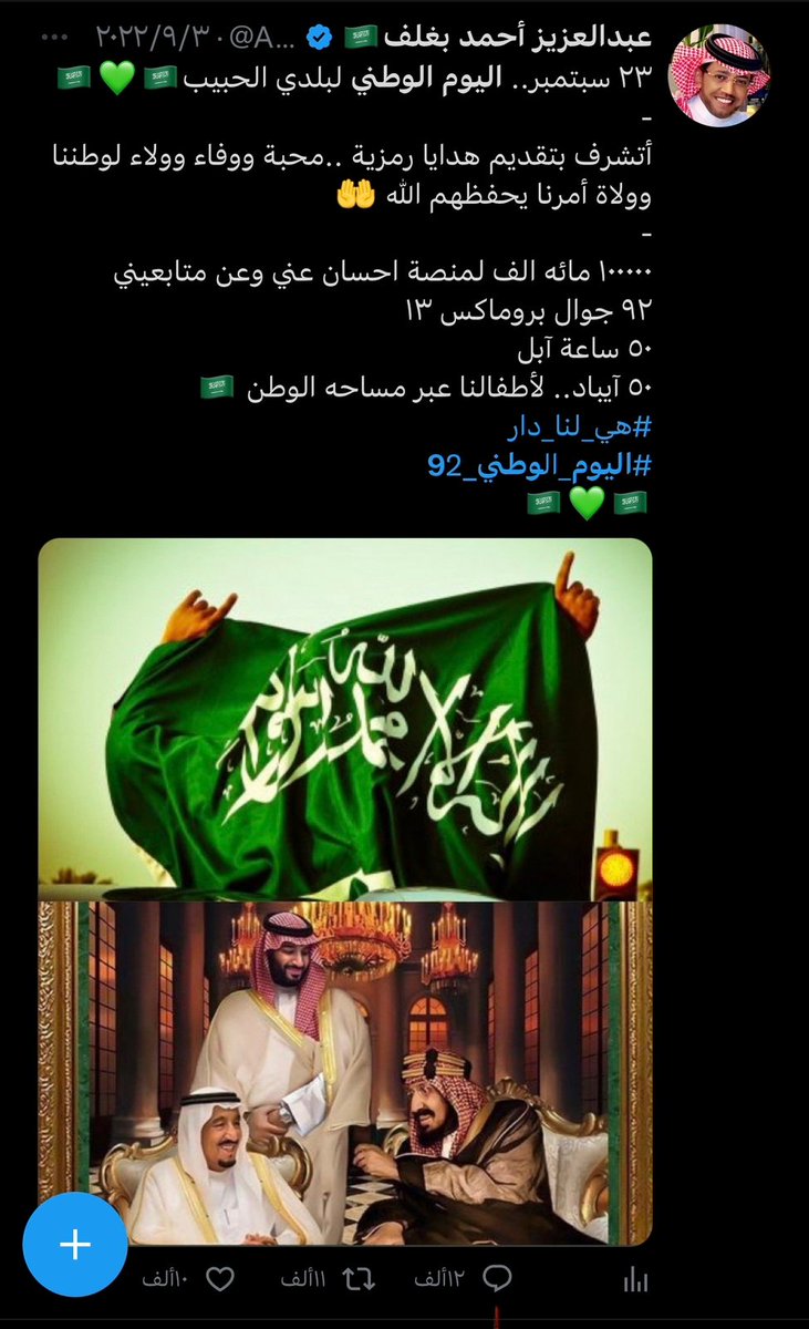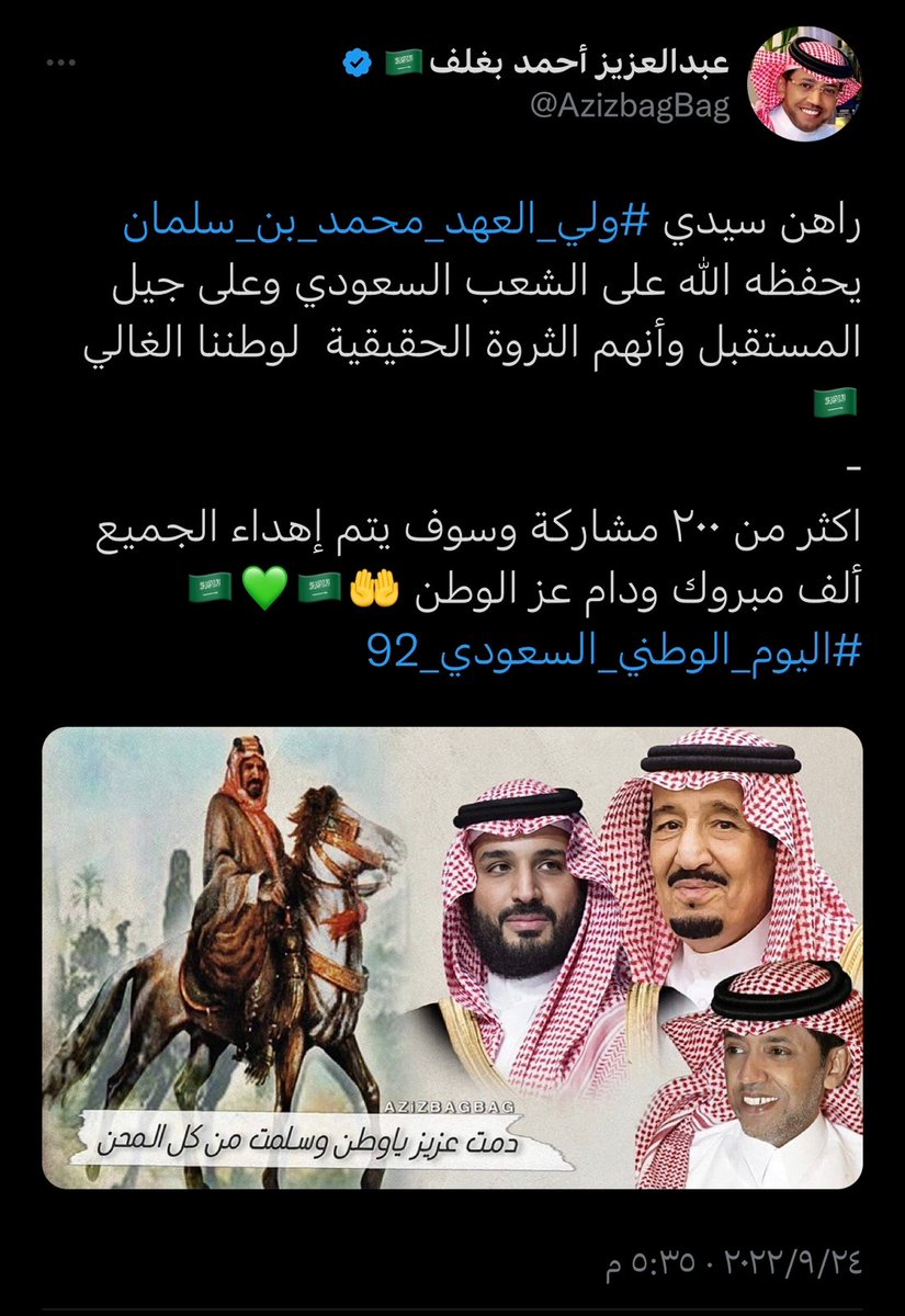 اليوم الوطني هو يوم العز والاعتزاز يوم توحدة فيه المملكة على يد الملك عبد العزيز ، واحتفالا بهذه المناسبة كان ابن الوطن البار الاول في المبادرة حيث قدم ١٠٠ ساعة ابل ، و ١٠٢ جوال ايفون ١٤ برو ماكس و ٢٠٨ ايباد عبر مساحة الوطن 💚🇸🇦