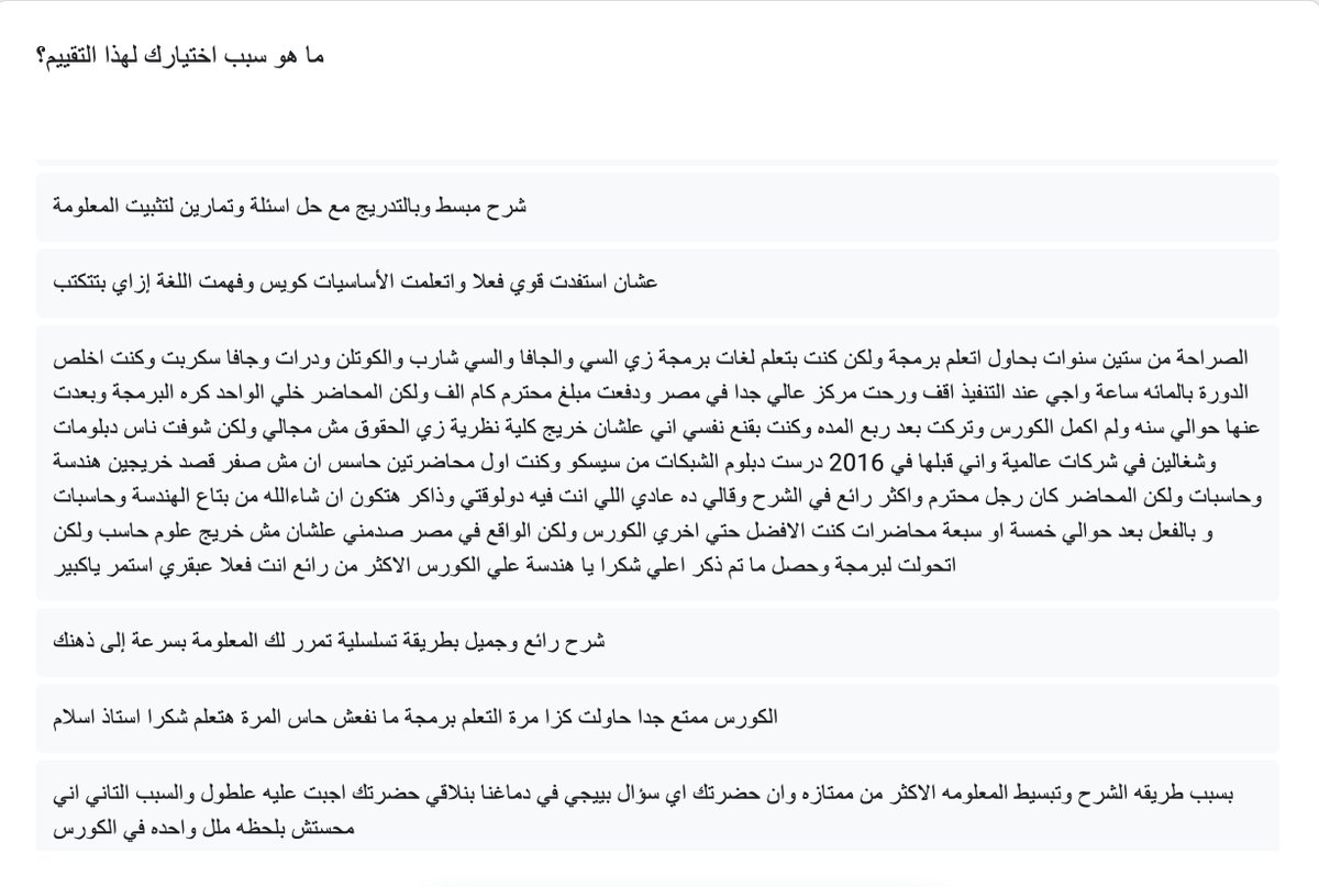 بالنسبة لي مفيش اسعد من شعور ان الواحد يحس انه عمل حاجة بهدف معين وقدر بفضل الله فقط، يحققه وكمان ربنا بعتله ناس تساعده وتدعمة في تطوير اللي عمله، وان شاء الله مازال هدفي هو استكمال انتاج افضل كورس تعلم برمجة للمبتدئين، في العالم ان شاء الله.