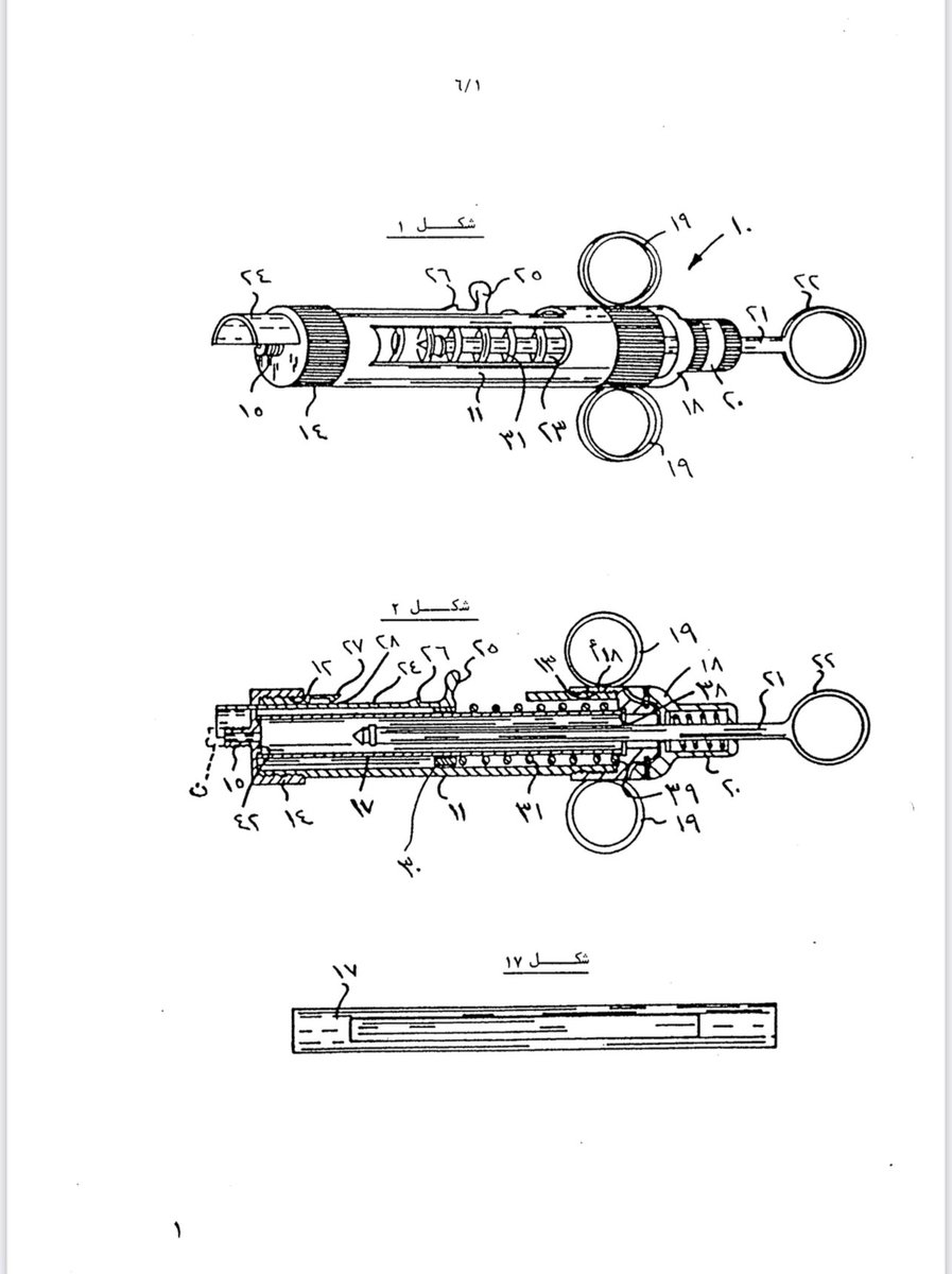 ودرع مقوس مركب بحيث يتحرك دخولًا وخروجًا خلال الشق المقوس منزلقًا بين الجسم الاسطواني الداخلي والجسم الاسطواني الخارجي.