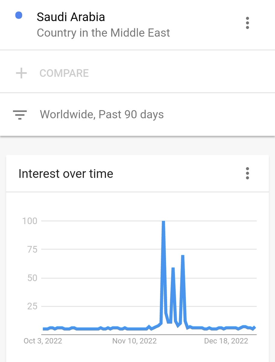و تعتبر كرة القدم من أكثر وسائل القوة الناعمة تأثيرا و الاستثمار فيها لها عوائد تتجاوز المستطيل الأخضر! حيث قفزت معدلات البحث عن السعودية في محرك قوقل بشكل كبير خلال الثلاث أشهر الماضية بسبب الرياضة كفوز المنتخب السعودي على الأرجنتين وأخبار التعاقد مع #كرستيانو_رونالدو