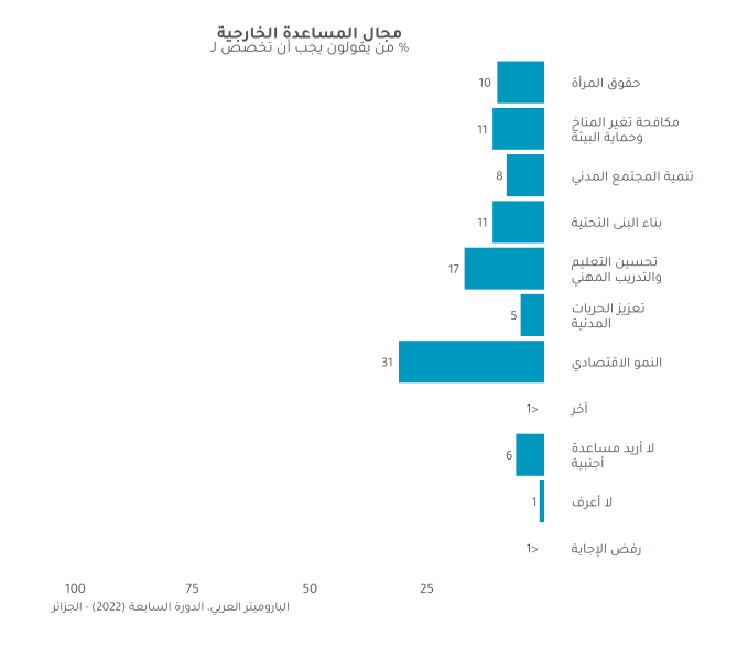 تصورات الجزائريين عن الخدمات الأساسية بشكل عام متواضعة المستوى. أعرب أغلب الجزائريين عن عدم الرضا إزاء نظام التعليم الحكومي (62 %) والرعاية الصحية (64%) وجودة الشوارع (67%) وجمع النفايات (57%).
