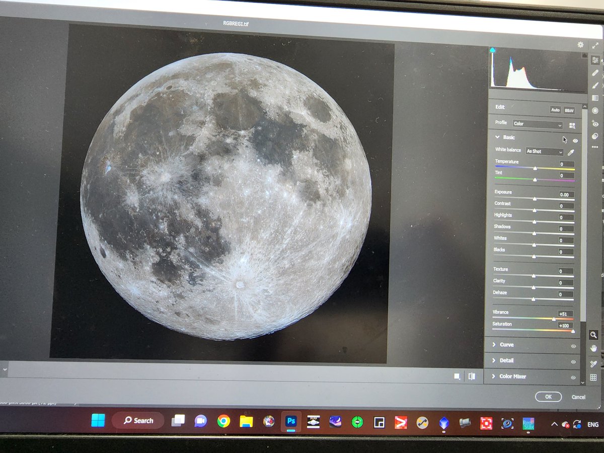بعد ما زدنا من حدة تفاصيل القمر .. ندخل القمر بالفوتوشوب عشان نزيد من إضاءته ومن حدة الألوان، والوهج ..الخ