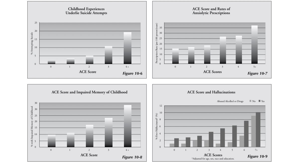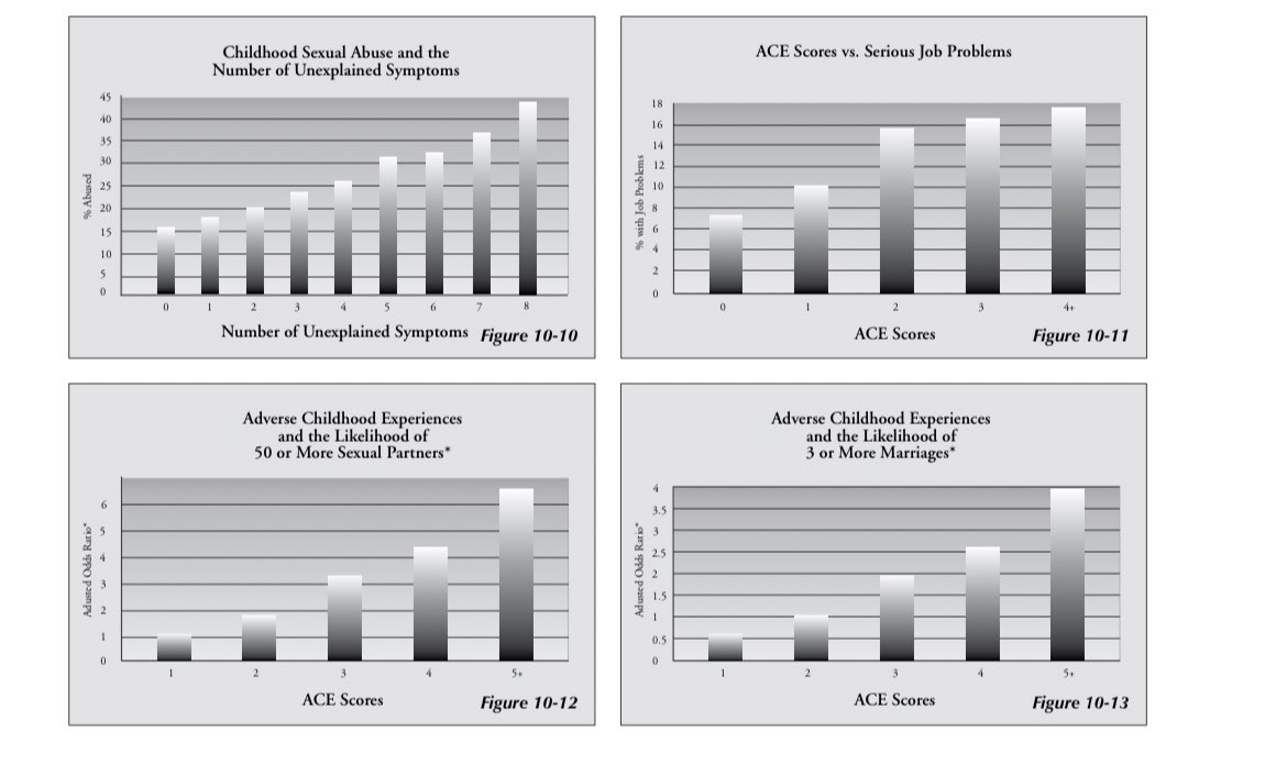 وبعد تحليل البيانات التي حصل عليها الباحثون من ما يقارب ١٧ ألف شخص وجدو أن كلما ارتفع عدد ACE الذي أفصح عنها الأفراد كلما ارتفعت نسبة المشاكل الصحية التي يعانون منها فمثلا: