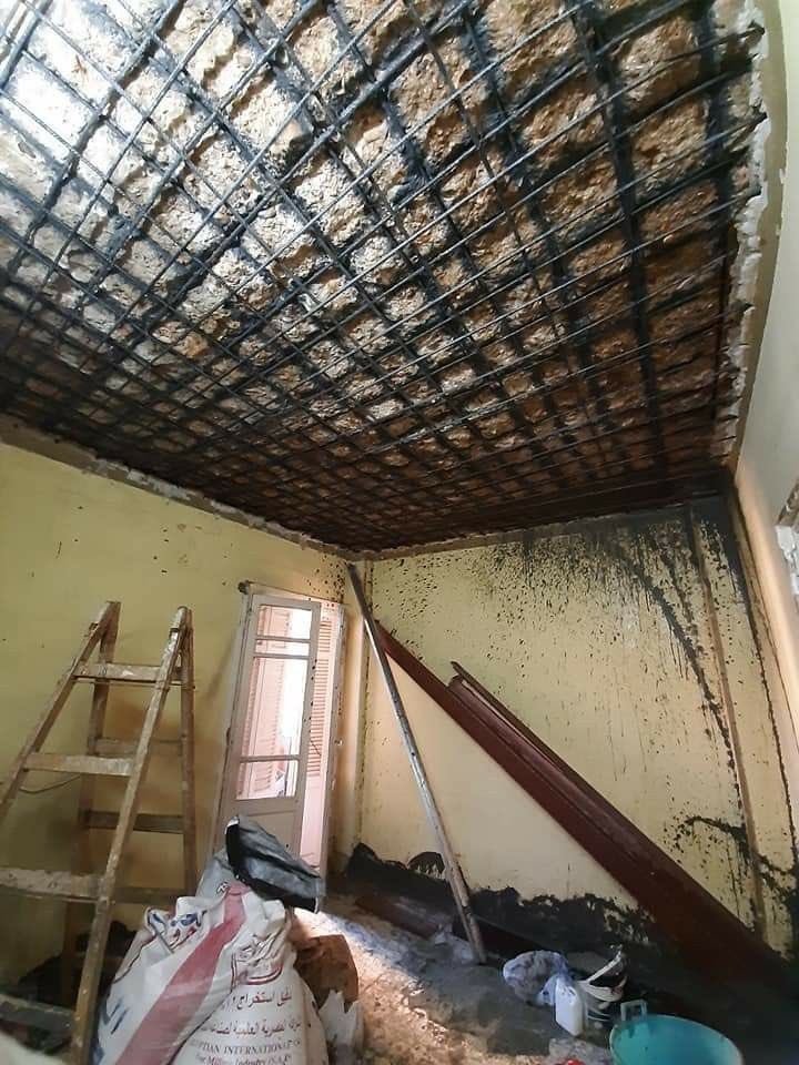 والحدائق المروية والأسطح المكشوفة مع عدم كفاية عزل المياه أو نظام / نقاط الصرف التالفة / المسدودة. تعاني البلاطة الخرسانية المسلحة المشبعة بدخول عوامل ضارة من تآكل شديد في حديد التسليح مع تآكل ممتد يتسبب في تشقق الخرسانة وتشظيها حتى تتسبب الألواح الكبيرة من الخرسانة الممزقة