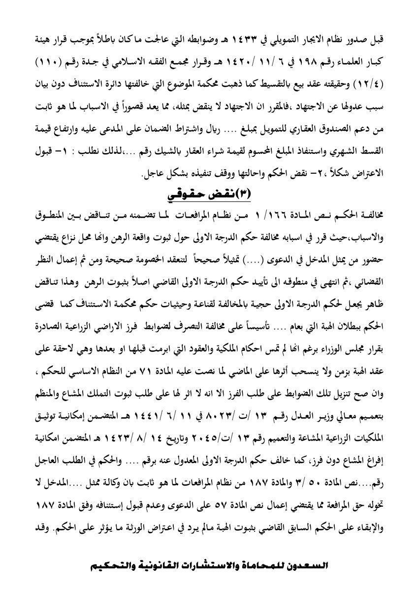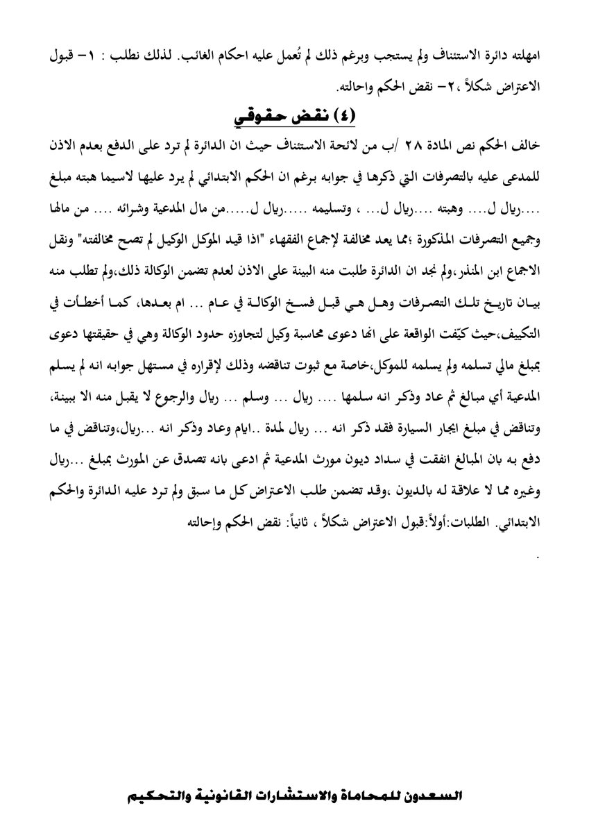 الاخيرة هي ذاتها مخالفة الحكم للشريعة والقانون، ولكشف عيوب الحكم الصالحة لان تكون محلاً للنقض ؛ يجب عليك ان تنقب في صك الحكم والانظمة حتى ينكشف امامك بعض او كل عيوب الحكم (ولهذا منهجية لايسع المقام لذكرها) وغالباً اسباب النقض تحتاج الى مزيد جهد ؛لانه تعقيب على حكم #يتبع