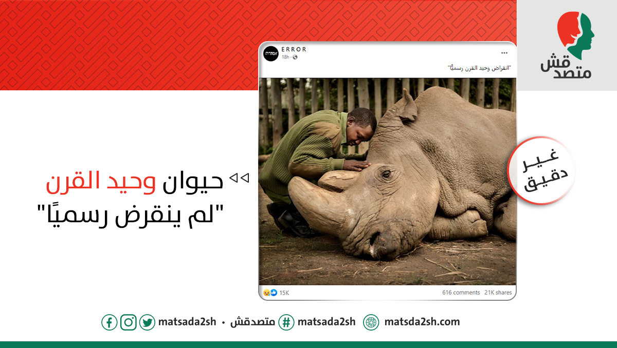 صورة منتشرة بشكل كبير جدًا، لحيوان وحيد القرن بجانبه شخص يرتدي زيًا رسميًا، مع تعليق: "انقراض وحيد القرن رسميًّا". ❌❌