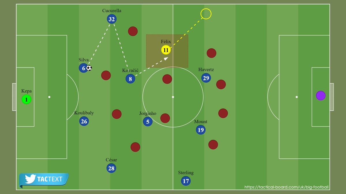 تواجد فيليكس كجناح أيسر سيمنح #تشيلسي خياراً إضافياً للصعود بالكرة عبر قدرته على النزول والتواجد بين الخطوط لاستلام الكرة واستغلال مهارته للخروج من الضغط إضافةً لمعدل التمريرات التقدمية الصحيحة الذي يمتلكه [2.24]