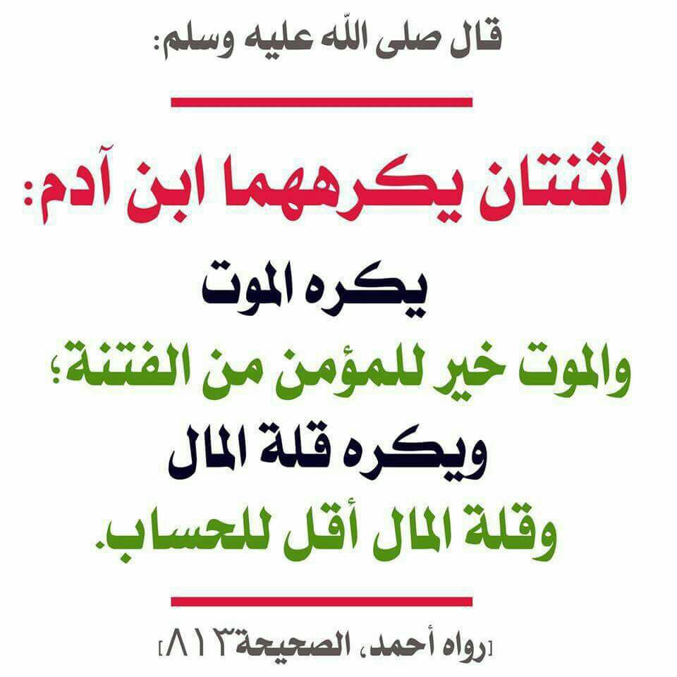 (يحب الإنسان الحياة، والموت خير لنفسه، ويحب الإنسان كثرة المال، وقلة المال أقل لحسابه). وهذا مرسل، كما قال البيهقي.