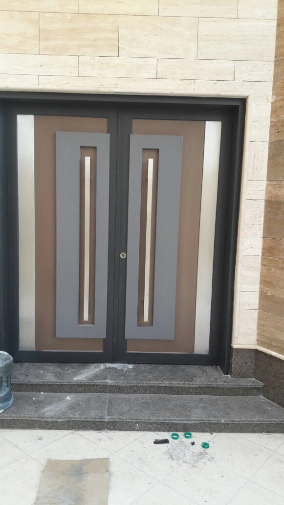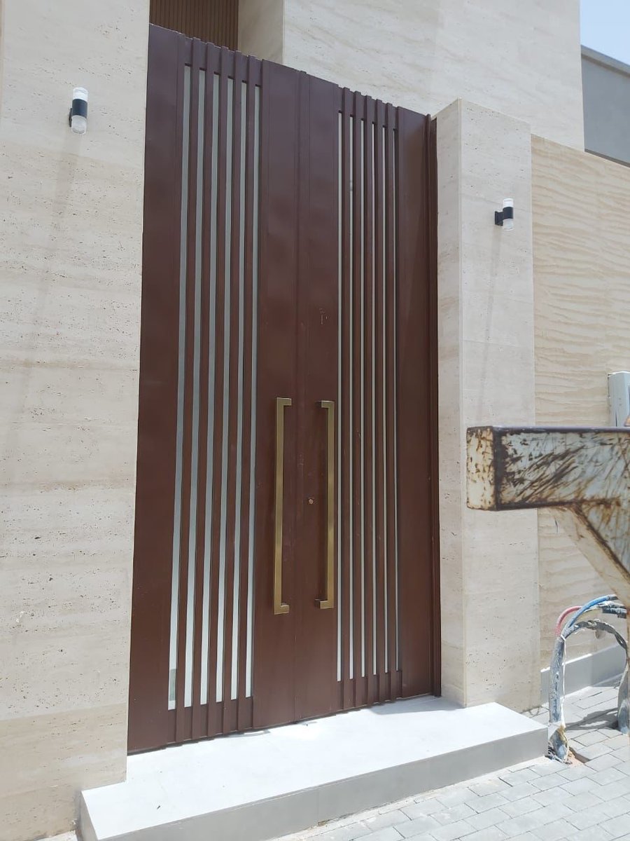 4️⃣ اضافة شرائح الستانلس ستيل 304 مقاوم الصدأ او ديكورات قص الليزر من الألمنيوم او الكلادنج الى الباب تمنح تصميمه المزيد من الحيوية والاناقة