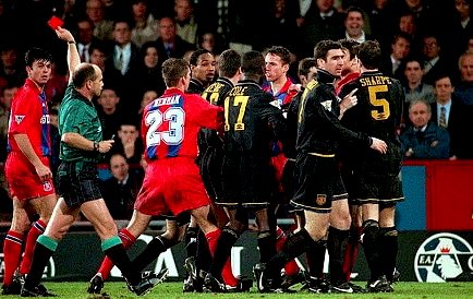 المباراة كانت عنيفة ، فيرغسون بين الشوطين ذهب للحكم وقال: لماذا لا تقوم بعملك السخيف كما ينبغي ؟