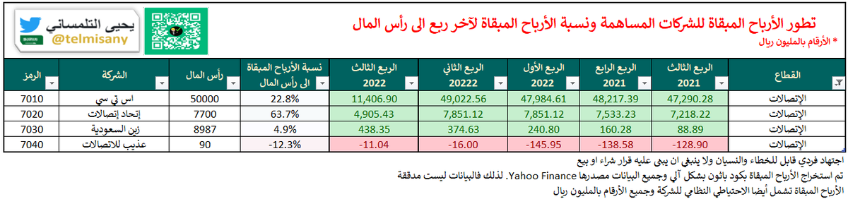 تطور الأرباح المبقاة لشركات قطاع #الأتصالات بنهاية الربع الثالث 2022