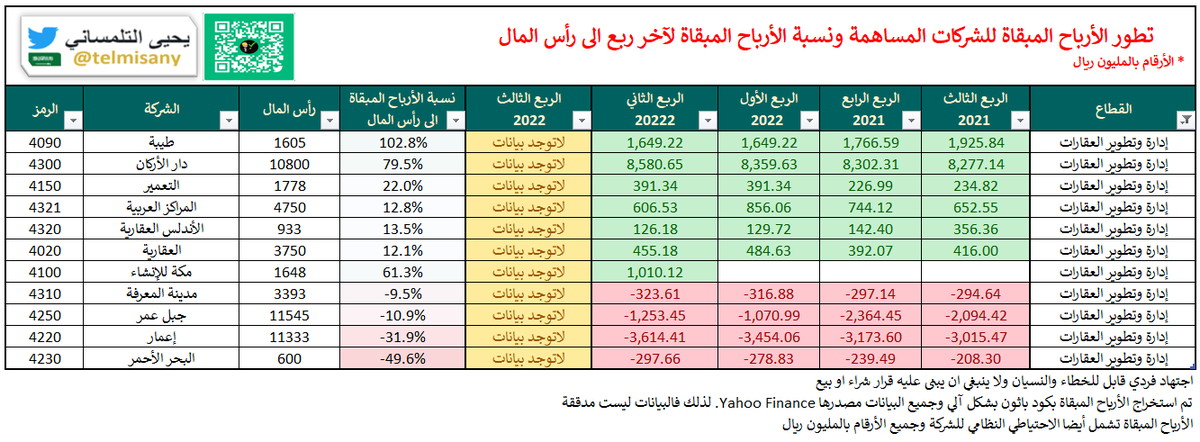 تطور الأرباح المبقاة لشركات قطاع #السلع الرأسمالية بنهاية الربع الثالث 2022