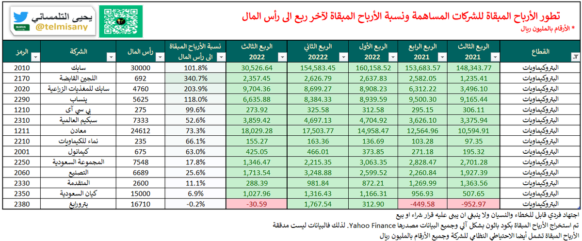 تطور الأرباح المبقاة لشركات قطاع #البتروكيماويات بنهاية الربع الثالث 2022