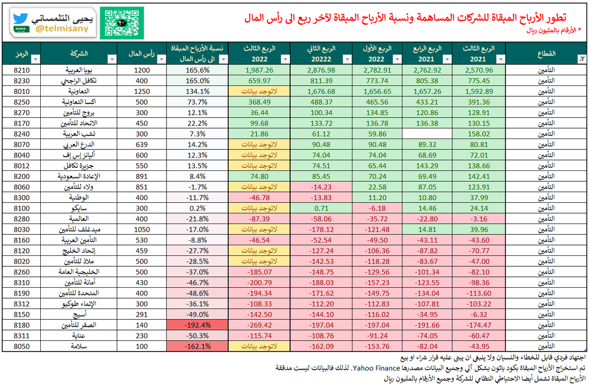 تطور الأرباح المبقاة لشركات قطاع #التأمين بنهاية الربع الثالث 2022