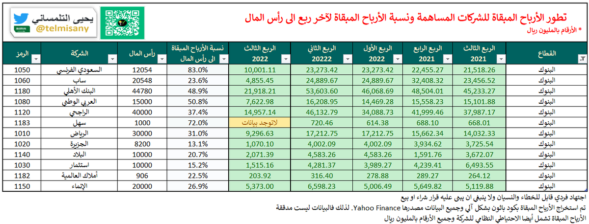 تطور الأرباح المبقاة لشركات قطاع #البنوك بنهاية الربع الثالث 2022