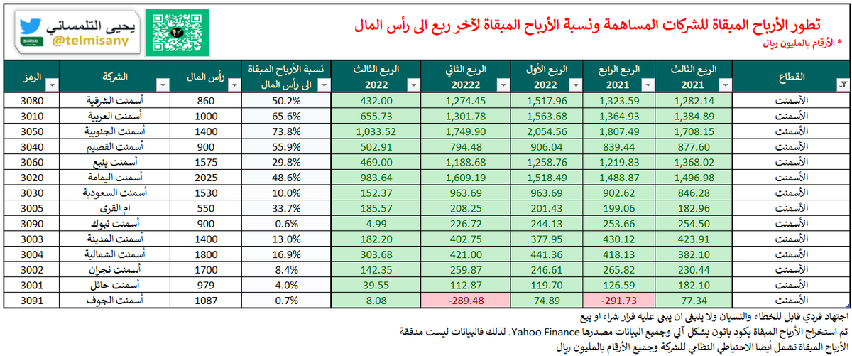 تطور الأرباح المبقاة لشركات قطاع #الأسمنت بنهاية الربع الثالث 2022
