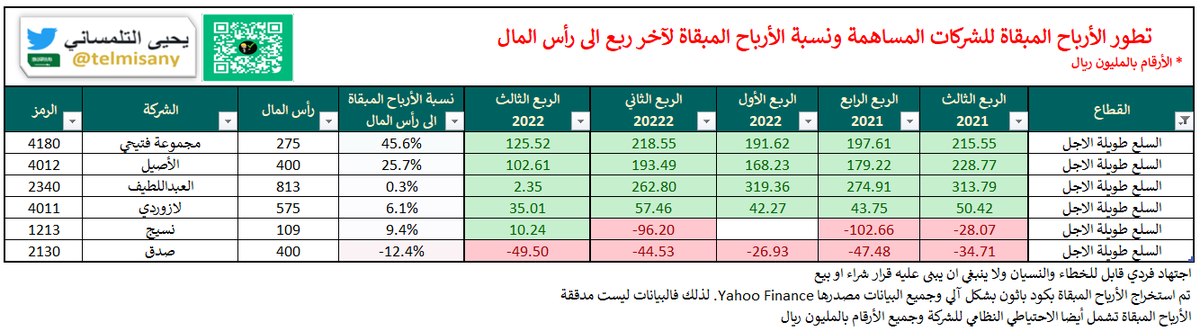 تطور الأرباح المبقاة لشركات قطاع #السلع طويلة الأجل بنهاية الربع الثالث 2022