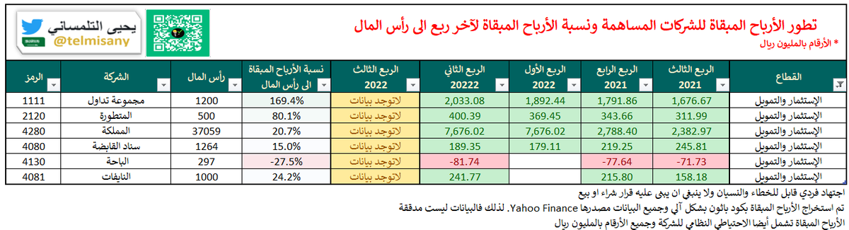 تطور الأرباح المبقاة لشركات قطاع #الاستثمار والتمويل بنهاية الربع الثالث 2022