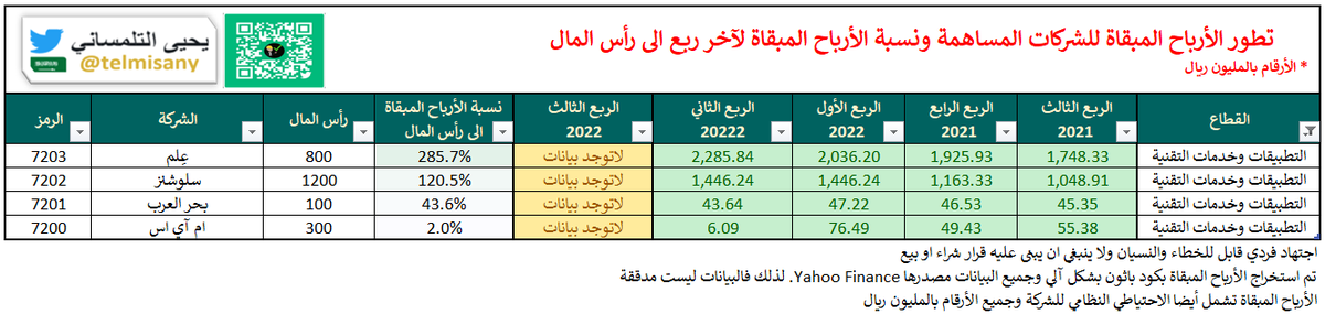 أنتبه: الأرباح المبقاة تشمل ايضا الأحتياطي النظامي للشركة وتم سحبها بالباثون بشكل آلي لذلك هي غير مدققة ولا ينبغي أخذ قرار شراء أو بيع على أساسها