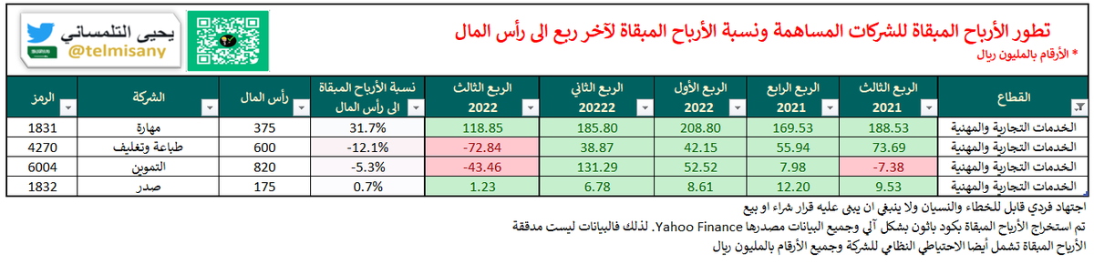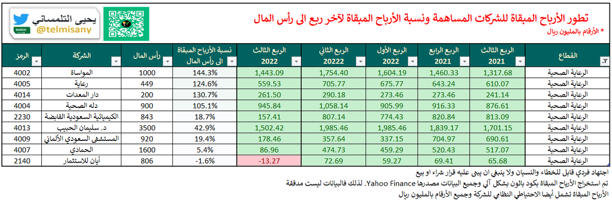 تطور الأرباح المبقاة لشركات قطاع #الرعاية_الصحية بنهاية الربع الثالث 2022