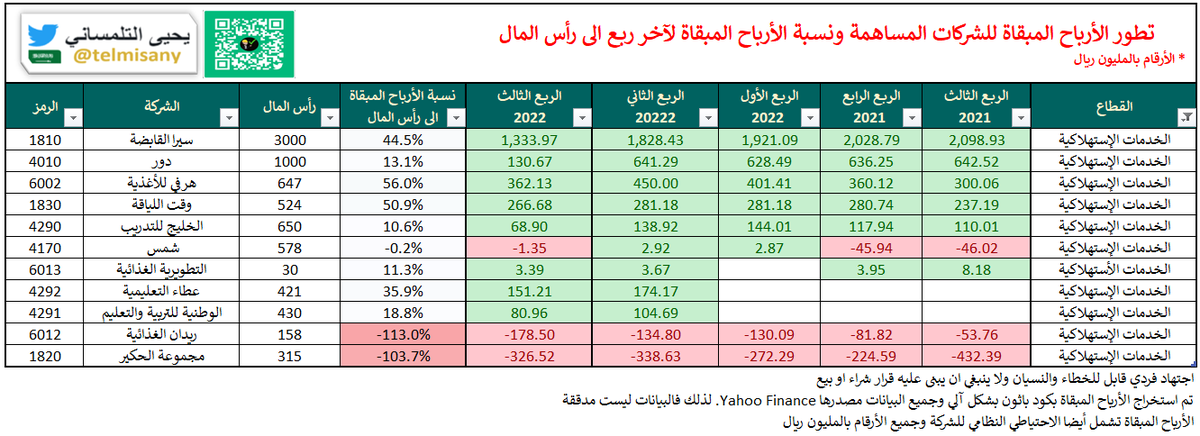 تطور الأرباح المبقاة لشركات قطاع #الخدمات_الأستهلاكية بنهاية الربع الثالث 2022