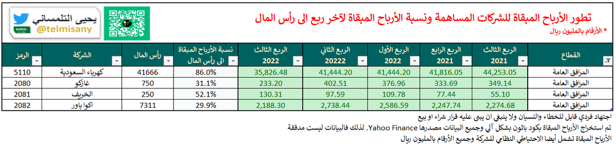 تطور الأرباح المبقاة لشركات قطاع #المرافق_العامة بنهاية الربع الثالث 2022