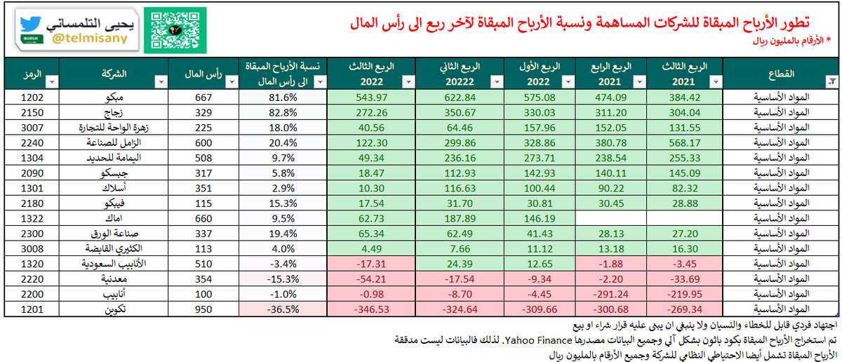تطور الأرباح المبقاة لشركات قطاع #المواد_الأساسية بنهاية الربع الثالث 2022