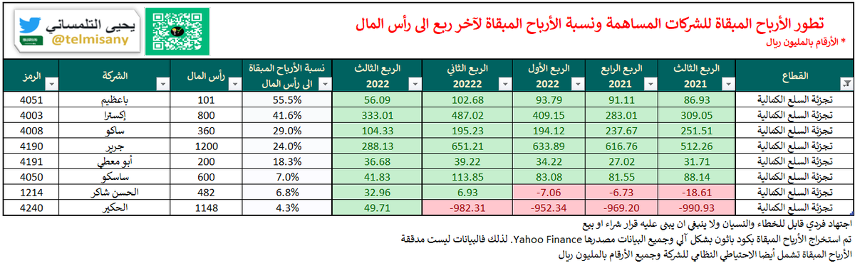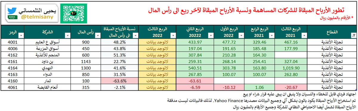 تطور الأرباح المبقاة لشركات قطاع #تجزئة_الأغذية بنهاية الربع الثالث 2022