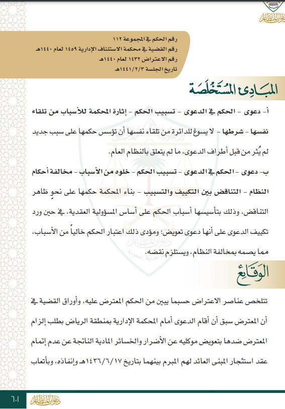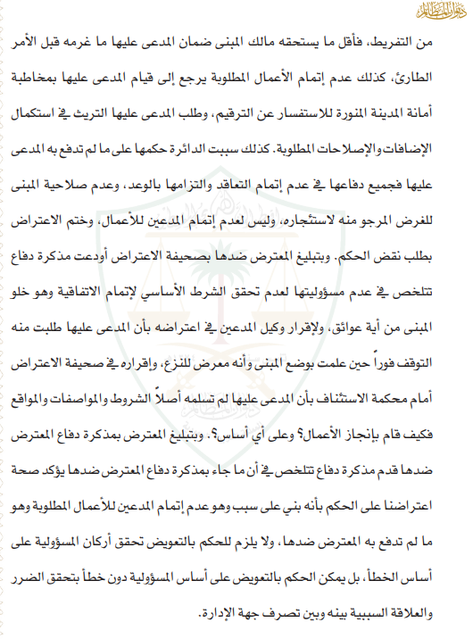 1- تسبيب الدائرة بعدم إتمام المدعي للأعمال المطلوبة، فهو سبب لم تُثره المدعى عليها، وليس من النظام العام حتى تتصدى له.