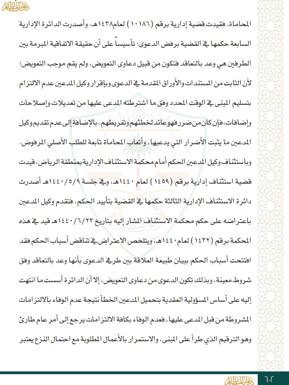 -الدائرة: رفضت الدعوى بتكييفها للعلاقة بأنها تعاقدية (وعد بالتعاقد) فهي من دعاوى التعويض، وليس هناك ما يوجبه؛ لأن المدعي لم يُسلم المبنى وفق اشتراطاته؛ وبالتالي فهو مقصّر.