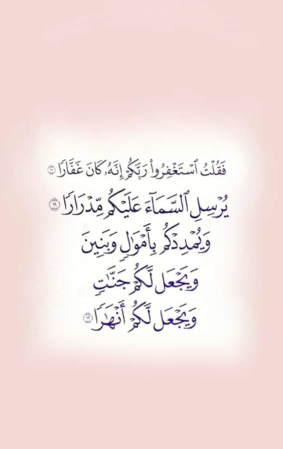 { فَقُلْتُ اسْتَغْفِرُوا رَبَّكُمْ إِنَّهُ كَانَ غَفَّارًا (10) يُرْسِلِ السَّمَاءَ عَلَيْكُمْ مِدْرَارًا (11) وَيُمْدِدْكُمْ بِأَمْوَالٍ وَبَنِينَ وَيَجْعَلْ لَكُمْ جَنَّاتٍ وَيَجْعَلْ لَكُمْ أَنْهَارًا } [نوح: 10: 12]