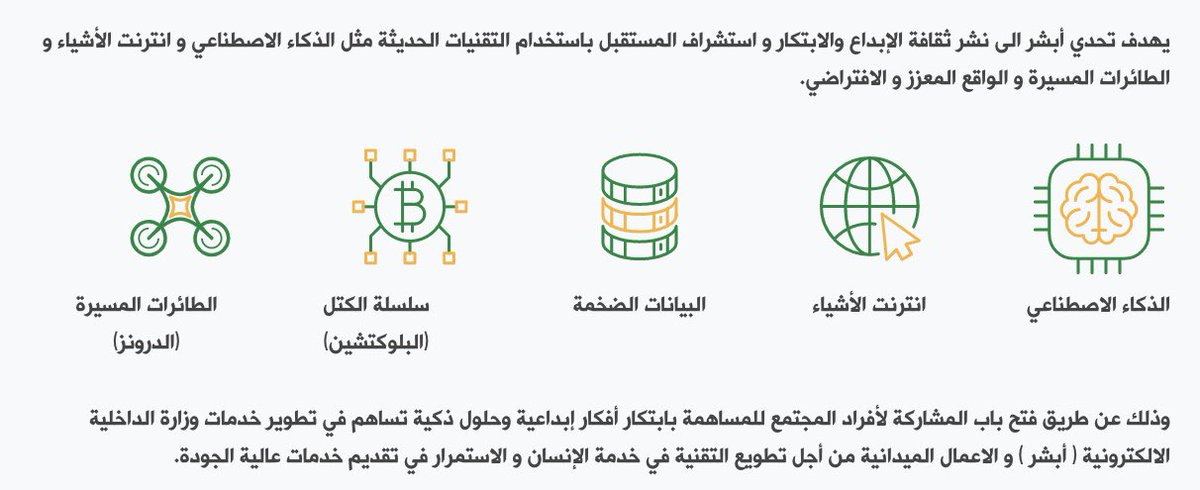 "هي مبادرة أطلقتها وزارة الداخلية لتشجيع أصحاب الأفكار والمبدعين على المشاركة في تطوير منصة أبشر وتمكين الإبداع في التحول الرقمي باستخدام التقنيات الحديثة.