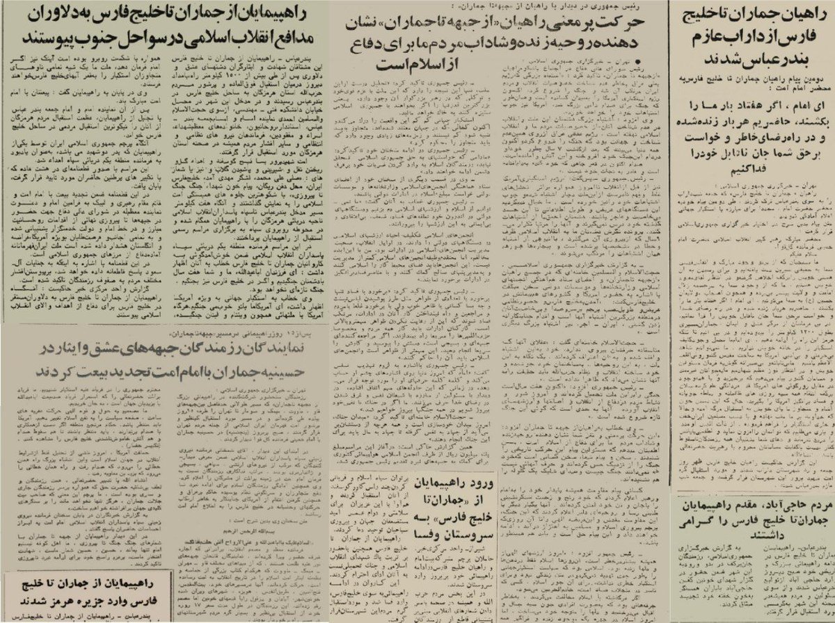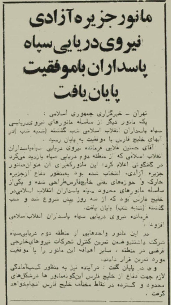 ۲۰روز است نفت ما را نمیخرند. در لارک ۲۰ میلیون بشکه داریم؛ نمیخرند. توطئه وسیع و گسترده است. باید از بن بست خارج شویم. باید توان خود را اضافه کنیم و ضربه وارد کنیم..... این کار اگر چه موفق نبود و یک مانور بسیار خوبی بود که با پی بردن ضعف های خود برای ادامه کار مفید است»
