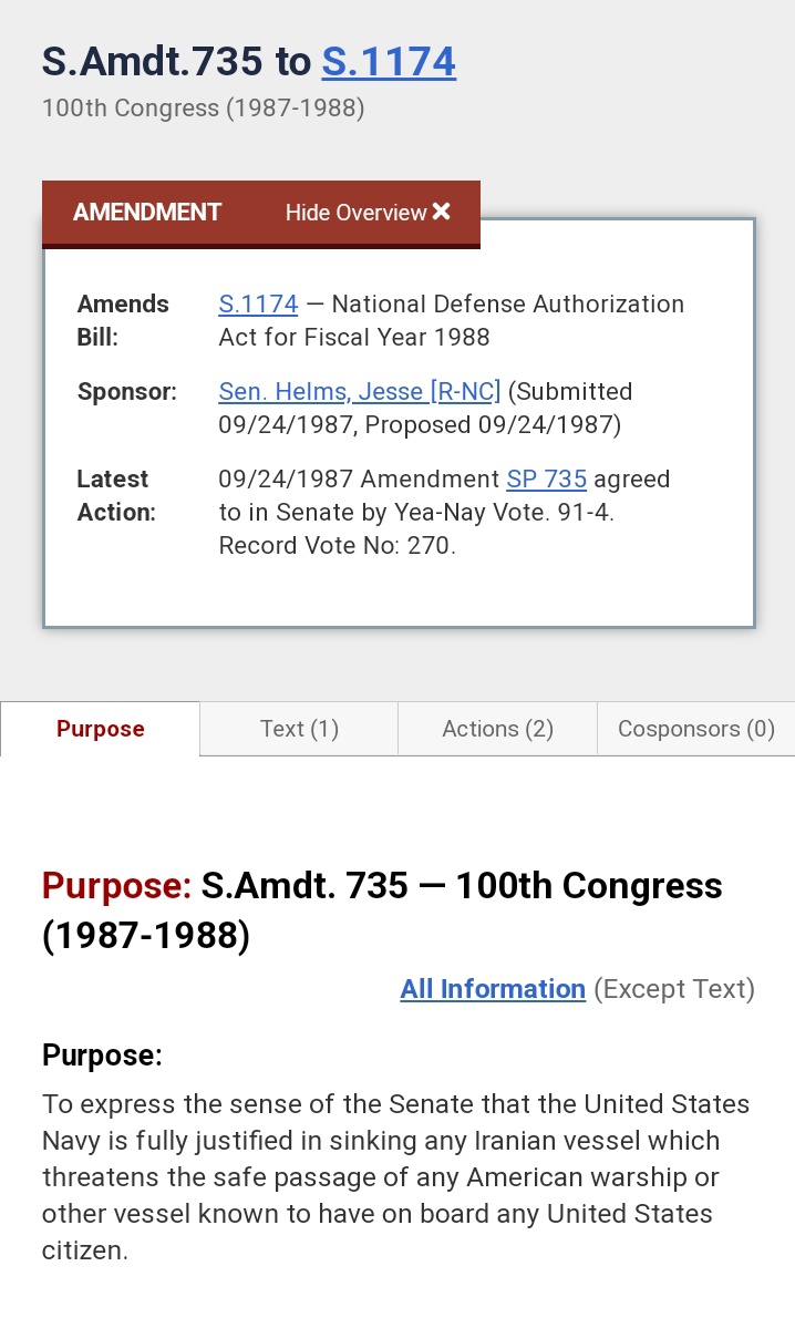 تحت تاثیر مواضع سیاسی و همچنین گسترش حملات ایران به کشتیها ؛ سنا نیز اصلاحیهای با اکثریت آرا را تصویب کرد که به نیروی دریایی آمریکا اجازه میداد هر کشتی ایرانی را که مانع عبور یک کشتی حامل یکی از اتباع آمریکا گردد، غرق کند.