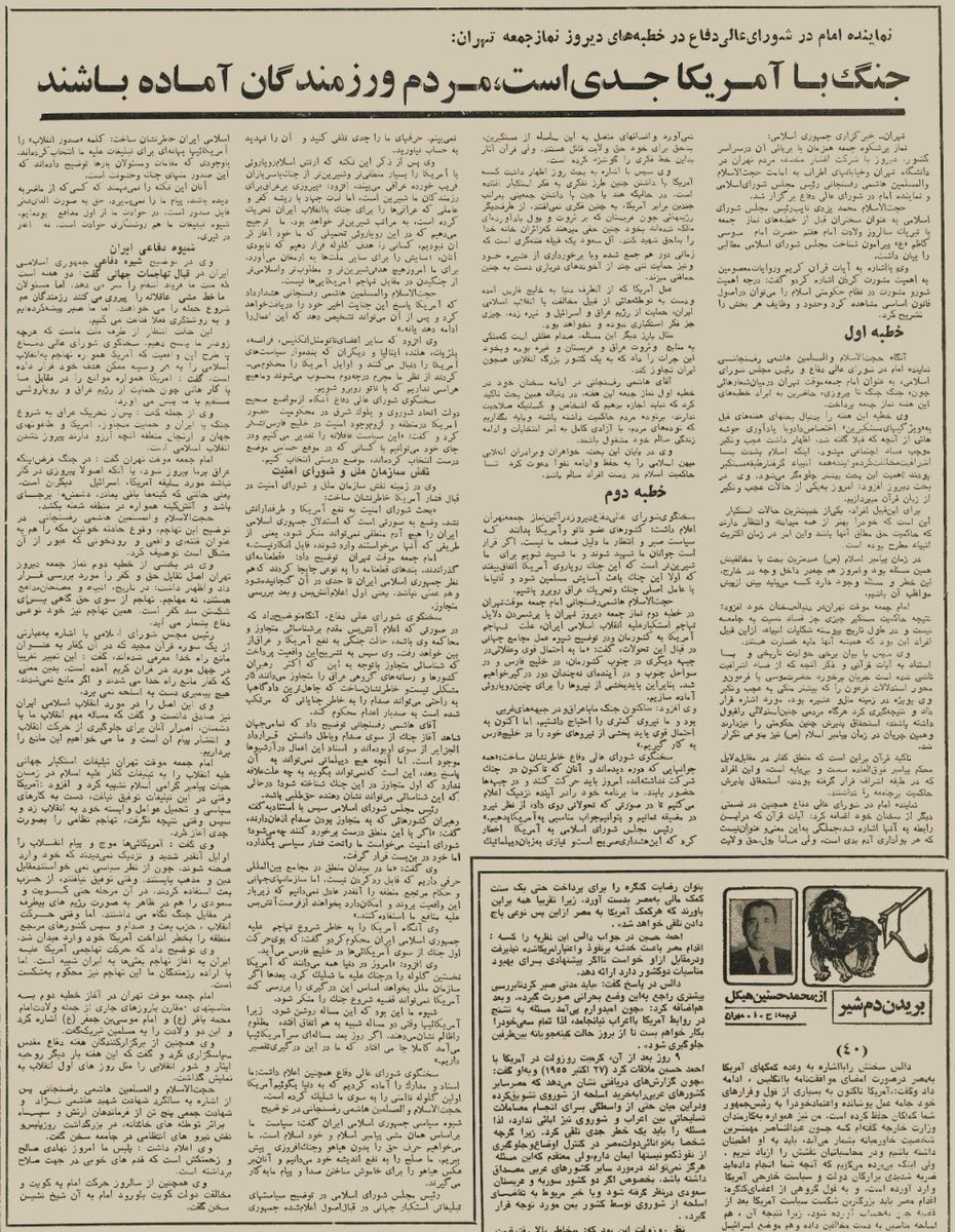 واقعیت این است که آمریکا با ما درگیر میشود و دنبال قطعنامه ۵۹۸ است که با فشار ما را تسلیم کند و نیروی دریایی تنها امید برای مقابله با آمریکاست آقای هاشمی دستورالعمل ابلاغ کرده و به نیروی دریایی در فاو و ماهشهر و بوشهر و بندرعباس آماده باش کامل و آمادگی زمینی داده است.»