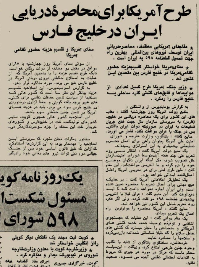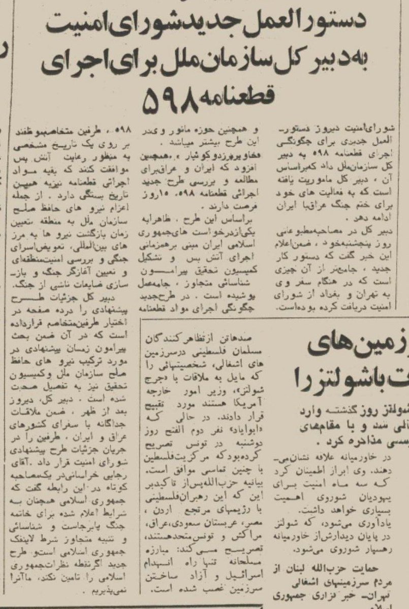 «ما نباید کاری کنیم اعراب متحد شوند. آمریکاییها و روسها به توافقاتی بویژه در رابطه با افغانستان رسیدهاند . در عرض دوماه آینده فکر نمی کنم تحریم تسلیحاتی به جایی برسد ولی احتمال میرود بعد از استنکاف از قبول قطعنامه ۵۹۸ ایران را در فشار بگذارند و تحریم تسلیحاتی را تصویب نمایند»
