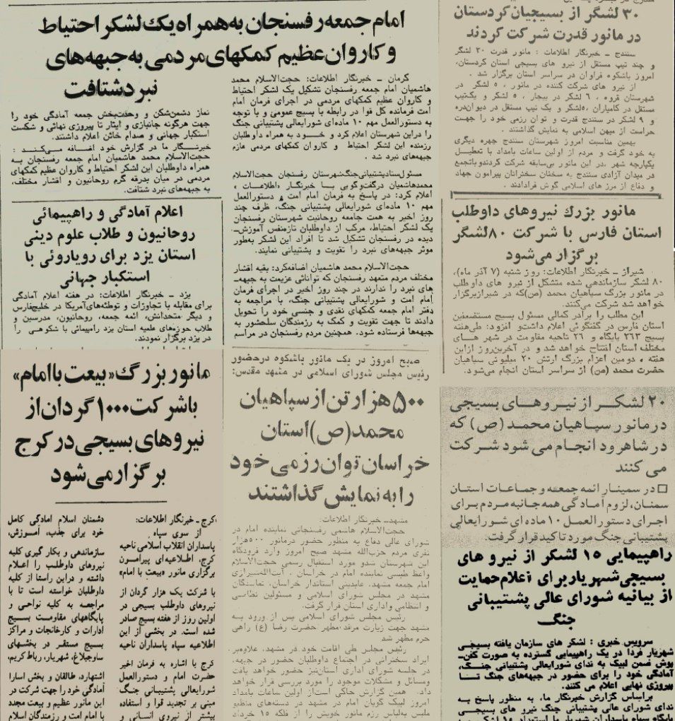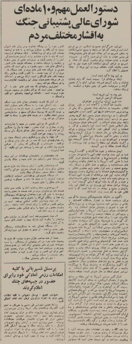ج) کارمنـدان دولت به میزان ۲۰٪ بایستی در جبههها حضور داشـته باشـند، نه صرف داوطلبان، بلکه شامل همه کارمندان میباشد و باید کارمندانی که به جبهه نرفتهاند به جبهه اعزام گردند.»