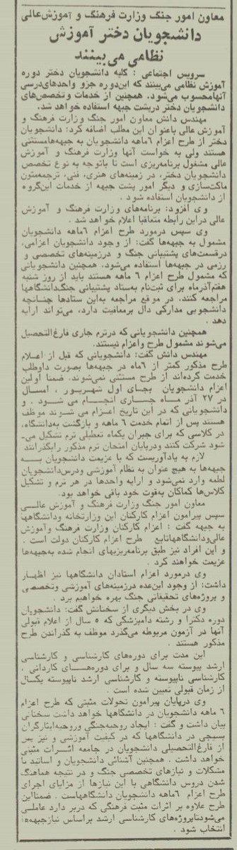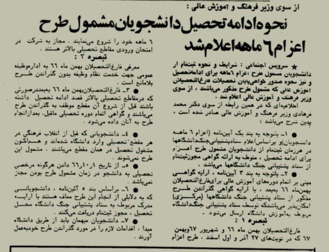 «الـف) دانشجویانی که نیمی از واحدهای تحصـیلی خویش راگذراندهاند جهت ادامه تحصـیل وگرفتن واحدهای جدید میبایسـت مدارکی دال برحداقل شـشماه حضور درجبهه را ارائه نماینـد. این مـدت جزو زمان خـدمت زیر پرچم محسوب و از دوسال خـدمت سربازی کسرخواهدشد.